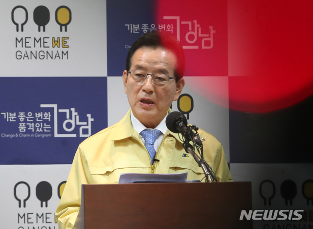 [서울=뉴시스] 고범준 기자 = 강남구에서 신종 코로나바이러스 감염증(코로나19) 확진 판정 2명이 발생한 26일 오후 서울 강남구 강남구청에서 정순균 강남구청장이 긴급 브리핑을 하고 있다. 2020.02.26.