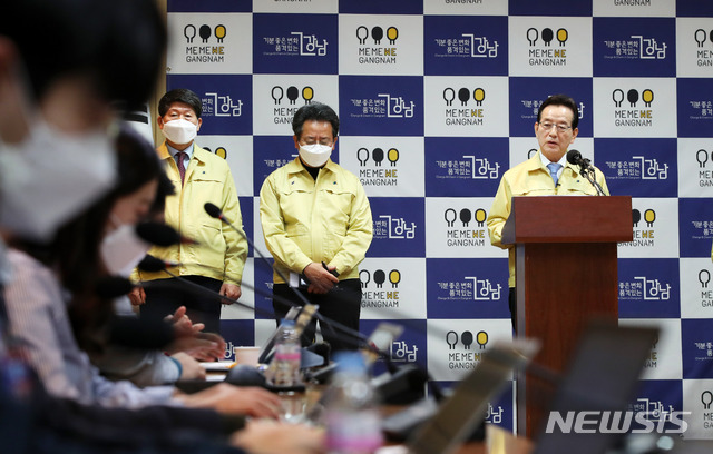 [서울=뉴시스] 고범준 기자 = 강남구에서 신종 코로나바이러스 감염증(코로나19) 확진 판정 2명이 발생한 26일 오후 서울 강남구 강남구청에서 정순균 강남구청장이 긴급 브리핑을 하고 있다. 2020.02.26.