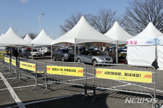 [고양=뉴시스] 최동준 기자 = 신종 코로나바이러스 감염증(코로나19) 확진자가 증가하고 있는 27일 경기 고양시 주교동 내 공용주차장에 마련된 차에 탄 채로 검사받는 '드라이브 스루(Drive Thry)' 식 선별진료소인 '고양 안심 카 선별진료소'가 운영되고 있다. 2020.02.27.