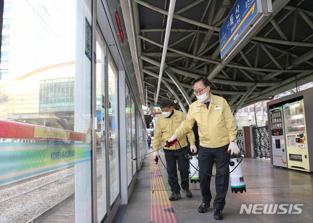 [서울=뉴시스]김근현 기자 = 유성훈 금천구청장이 28일 오전 서울 금천구 독산역과 주변을 신종 코로나바이러스 감염증(코로나19) 확산을 막기 위해 방역하고 있다. (사진=금천구 제공) 2020.02.28.
