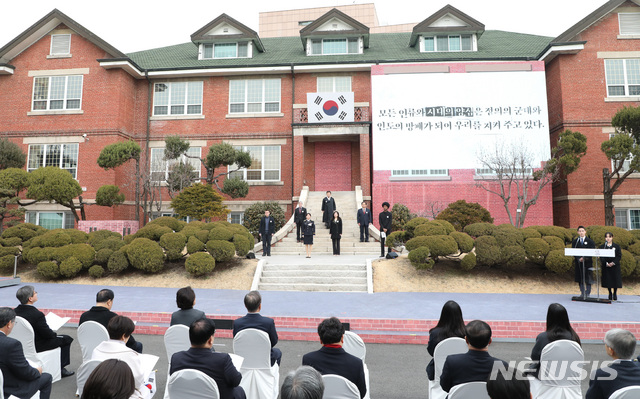 [서울=뉴시스]박영태 기자 = 김원웅 광복회장과 참석자들이 1일 서울 종로구 배화여고에서 열린 3.1절 기념식에 참석해 독립선언서를 낭독하고 있다. 이날 독립선언서는 원어민과 귀화 한국인 등이 원문, 영어, 일어, 중국어, 러시아어, 수어, 쉽고 바르게 읽는 선언문 순으로 낭독했다. 왼쪽부터 최일리야 톡립운동가 최재형 선생의 4대손, 달시 파켓 영화 기생충 번역가, 조계화 귀화 경찰관, 김원웅 광복회장, 이현화 수어통역사, 호사카 유지 세종대 독도종합연구소장, 한현민 패션모델. 2020.03.01.