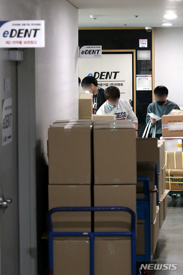 [서울=뉴시스]김근현 기자 = 정부의 무리한 마스크 공급 요구로 손실을 보다 생산 중단 결정을 내린 치과 재료 전문 기업 이덴트 직원들이 6일 오전 서울 중구 이덴트 물류센터에서 업무를 하고 있다. 신선숙 이덴트 대표는 입장문을 통해 "조달청에서 원가 50% 정도만 인정해주겠다는 통보와 일일 생산량 10배에 달하는 생산수량 계약을 요구하는 상황"이라며 "손실을 감수하면서까지 이덴트 마스크를 생산해야 하는 명분도, 의욕도 상실했다"고 지난 5일 밝혔다. 2020.03.06.