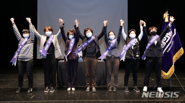 [서울=뉴시스]이윤청 기자 = 윤서연(왼쪽부터), 이지원, 이성숙, 김은주, 원소유, 장지유, 김진아 여성의당 공동대표가 세계 여성의 날인 8일 오전 서울 강남구 sac아트홀에서 열린 여성의당 창당대회에서 대표 수락연설을 마치고 기념촬영을 하고 있다. 2020.03.08.