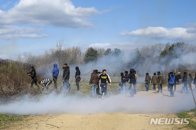 [에디른=AP/뉴시스] 7일(현지시간) 그리스와 국경을 맞댄 터키 서쪽 끝 도시 에디른에 시리아 난민들이 몰려있다. 난민의 유입을 막기 위해 그리스 경찰이 던진 최루탄이 곳곳에서 연기를 피우는 모습도 보인다. 2020.3.10.