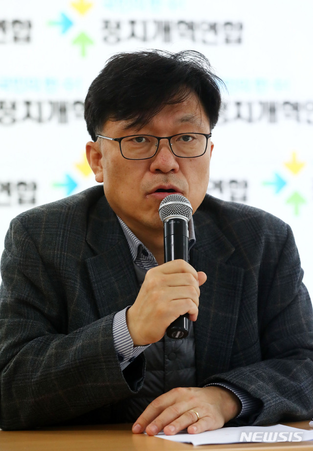 [서울=뉴시스]홍효식 기자 = 하승수 정치개혁연합(가칭) 집행위원장이 10일 오전 서울 종로구 운현하늘빌딩에서 열린 창당 일정 발표 및 선거연합정당 기조에 관한 기자회견에서 발언하고 있다. 2020.03.10.