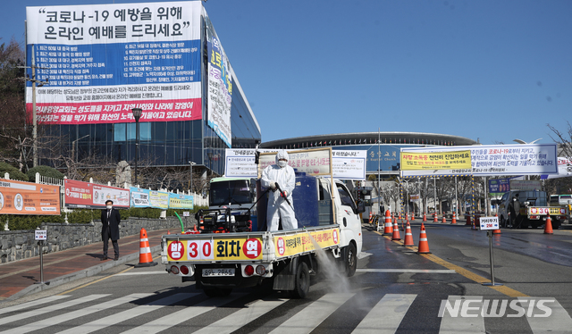[서울=뉴시스] 조수정 기자 = 신종 코로나 바이러스 감염증(코로나19) 집단 감염으로 인한 지역사회 확산을 막기 위해 정부가 종교 행사 및 집회 중단을 권고했음에도 불구하고 22일 오전 예배를 강행한 서울 구로구 연세중앙교회 앞에서 교회 관계자들이 방역을 하고 있다. 연세중앙교회 관계자는 이날 정문 앞에서 취재중인 기자들에게 보도자료를 배포하며 성도들에게 최대한 온라인 예배를 부탁하고 있으며 성전에서는 출입 성도간 2미터 간격을 유지하는 등 코로나19 확산 방지에 최선을 다하고 있다고 밝혔다. 사회적 거리 유지하기, 마스크 착용 의무화, 발열 체크, 소독, 교회내 방역, 교회 내 음식 섭취 금지 등 국가가 장려하는 7가지 감염예방 수칙을 철저히 준수하고 있으며 해외 혹은 대구 경북 지역 방문, 확진자 접촉 등을 한 사람들과 고위험군(65세 이상, 임산부, 미취학 아동, 장애인, 기저질환자)은 교회 코로나19 대책위원회에 자가격리 보고서를 제출하고 30일간 자가격리 하며 온라인 예배를 하고 있다고도 전했다. 2020.03.22.
