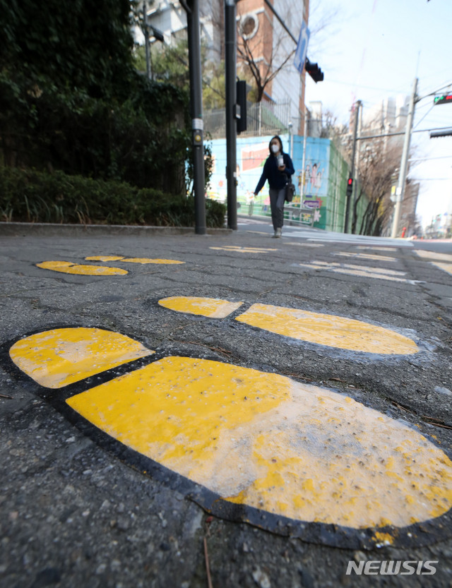 [서울=뉴시스] 박미소 기자 = 민식이법(도로교통법·특정범죄 가중처벌 등에 관한 법률 일부개정법률안) 시행을 하루 앞둔 24일 오전 서울 서초구 원명초등학교 앞 어린이 통학로에 횡단보도에 안전한 발걸음 노란발자국 프린팅이 붙어있다. 2020.03.24.