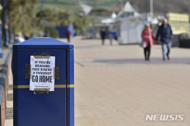 [런던=AP/뉴시스]영국 정부가 신종 코로나바이러스 감염증(코로나19) 확산을 줄이기 위해 사람들의 집 밖 이동을 제한하는 가운데 25일(현지시간) 남부 웨일스 배리 섬의 한 쓰레기통에 "이것을 읽고 있는 당신은 코비디어트(Covidiot). 집으로 가라"라는 문구가 붙어 있다. '코비디어트'는 'Covid(신종 코로나바이러스)'와 'Idiot(바보)'을 합친 말로 코로나19 사태에 비상식적으로 행동하는 사람을 가리키는 신조어다. 영국의 코로나19 확진자 수는 25일 오전 기준 전날보다 1452명 급증한 9529명이고 사망자는 463명으로 집계됐다. 2020.03.26.