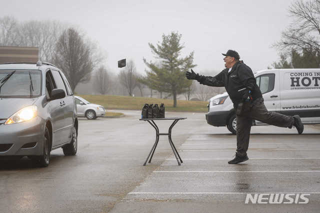[어번데일=AP/뉴시스]미 아이오와주 어번데일의 프리드릭스 커피점 주인 게리 마이어가 28일(현지시간) 주차장에서 주민들에게 무료 커피를 던져주고 있다. 마이어는 주민들이 신종 코로나바이러스 감염증 여파로 집에서 보내는 시간이 많아지자 지역 사회 화합을 위해 무료로 커피를 나눠주며 이날 오전을 보냈다. 2020.03.28.