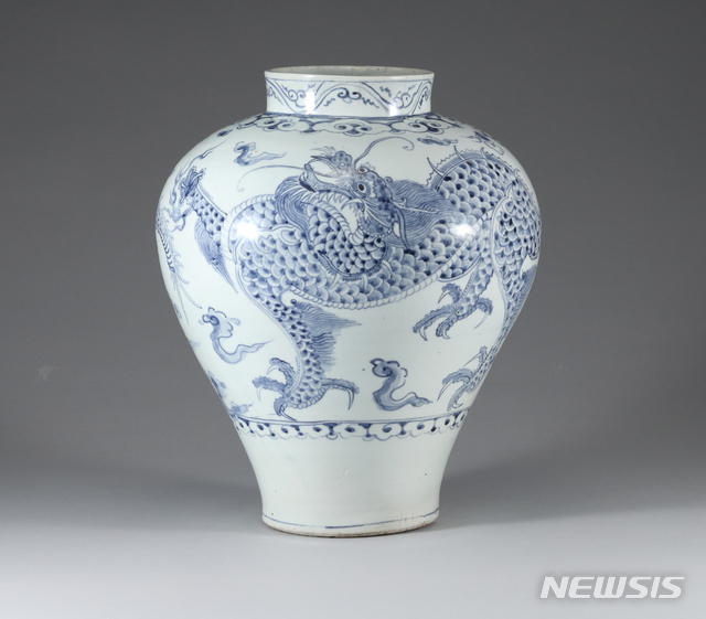 다보성 갤러리는 "전시 수익금 중 일부는 코로나19로 피해가 심각한 지역의 의료지원을 위한 기부금으로 사용될 예정"이라고 밝혔다. 사진=백자청화운룡문호(18세기, 43.2×16×16.5cm), 다보성갤러리 제공. 2020.4.01. [email protected]