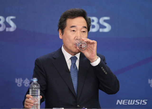 [서울=뉴시스] 김진아 기자 = 이낙연 더불어민주당 상임공동선대위원장이 2일 서울 양천구 방송회관에서 열린 방송기자클럽 토론회에서 물을 마시고 있다. 2020.04.02. [email protected]