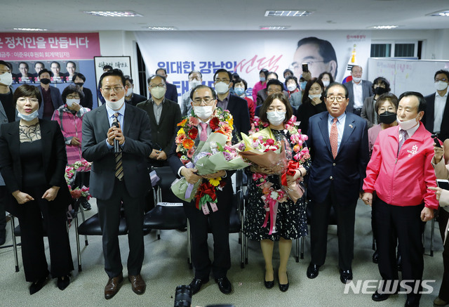 [서울=뉴시스] 최동준 기자 = 제21대 국회의원선거 강남구갑 태구민(태영호) 미래통합당 당선자가 16일 새벽 서울 강남구 선거사무소에서 부인 오혜선 여사, 지지자들과 애국가 제창을 하고 있다. 2020.04.16.