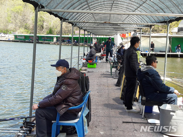 [용인=뉴시스] 박태홍 기자 = 정부가 신종 코로나바이러스 감염증(코로나19) 확산 방지를 위한 사회적 거리 두기를 일부 완화한 첫 주말인 26일 오후 경기 용인시 기흥구 모 저수지에서 마스크를 한 많은 사람이 간격을 유지하며 낚시하고 있다. 2020.04.27.