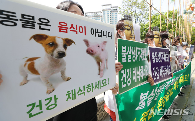 [서울=뉴시스]홍효식 기자 = 비건을 지향하는 모든 사람들(비지모)이 30일 서울 종로구 조계사 앞에서 부처님 가면을 쓰고 불살생 채식을 촉구하는 퍼포먼스 기자회견을 하고 있다. 2020.04.30.