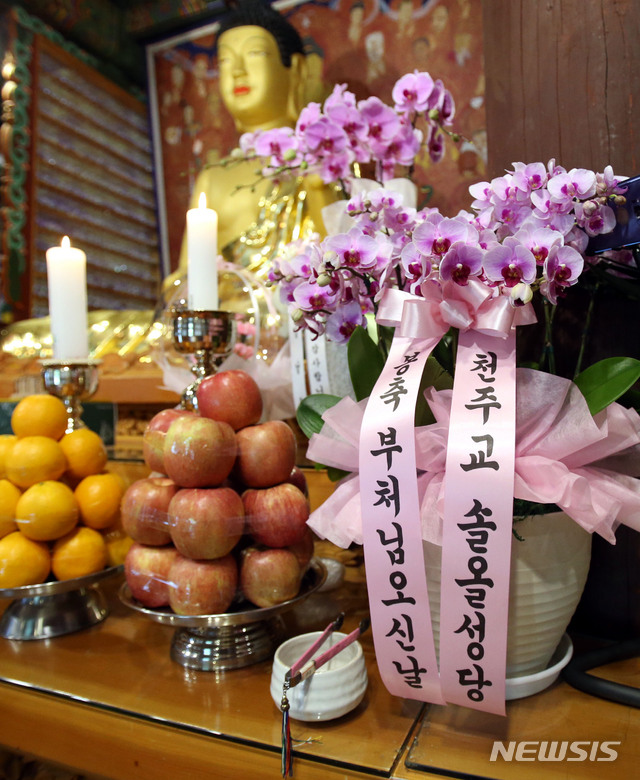 [강릉=뉴시스] 김경목 기자 = 불기 2564년 부처님 오신 날인 30일 오후 강원 강릉시 대한불교조계종 제4교구 본사 월정사 강릉포교당 관음사 법당 부처님 앞에 천주교 솔올성당에서 보낸 축하 화분이 눈길을 끈다. 2020.04.30.