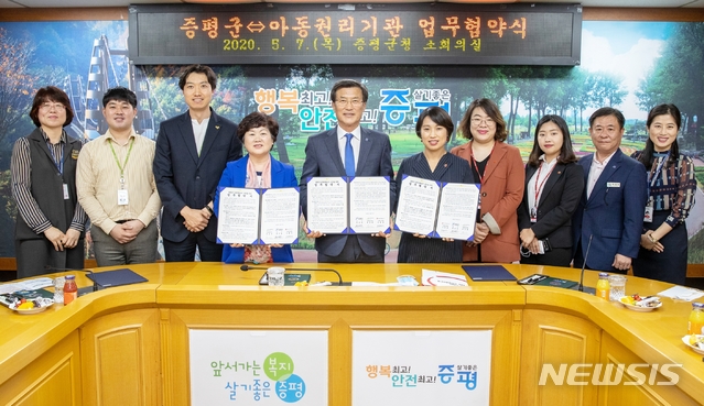 [증평=뉴시스]강신욱 기자 = 충북 증평군은 7일 군청 소회의실에서 국제적 아동인권 민간기구인 굿네이버스 충북본부, 세이브더칠드런 서부지부와 아동친화도시 조성을 위한 업무협약을 하고 있다. (사진=증평군 제공) 2020.05.07.