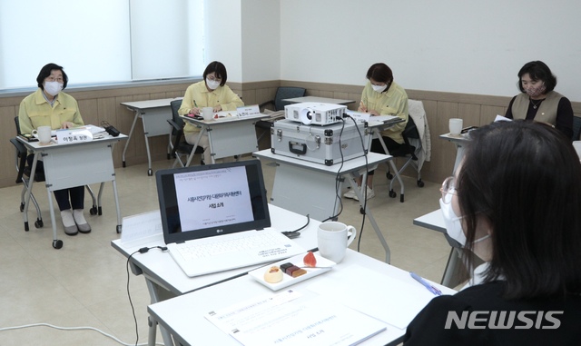 [서울=뉴시스] 조수정 기자 = 이정옥 여성가족부 장관이 14일 오후 경기도 시흥시 건강가정ㆍ다문화가족지원센터를 방문해 돌봄취약계층 초등학생의 원격수업을 지원하는 학습도우미들을 격려하고, 현장의 애로사항을 듣고 있다. (사진=여성가족부 제공) 2020.05.14.