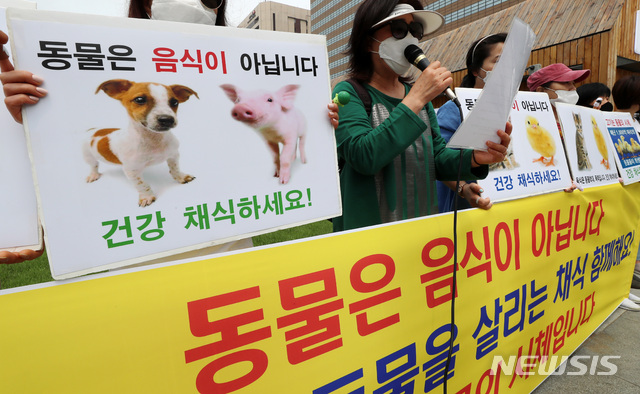 [서울=뉴시스] 이영환 기자 = 비건(Vegan)을 지향하는 모든 사람들(비지모) 회원들이 17일 오후 서울 종로구 광화문광장에서 '육식중단, 동물해방 촉구 기자회견'을 하고 있다. 2020.05.17.