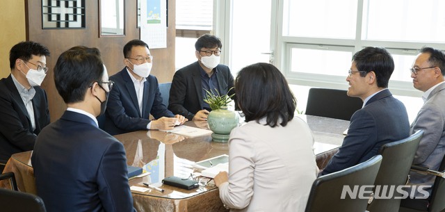 [서울=뉴시스]김우호 인사혁신처 차장이 20일 세종시 반곡동 한국법제연구원을 방문해 김계홍 원장과 공직윤리 제도에 대한 의견을 나누고 있다. (사진=인사혁신처 제공) 2020.05.20.