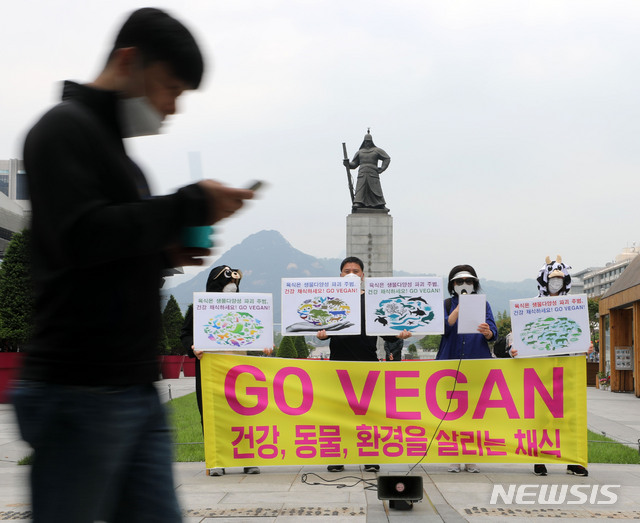 [서울=뉴시스]박주성 기자 = 비건(Vegan)을 지향하는 모든 사람들 회원들이 22일 오후 서울 광화문 이순신동상 앞에서 '국제 생물다양성의 날'을 맞아, 비건(Vegan) 채식을 촉구하는 기자회견을 하고 있다. 2020.05.22.