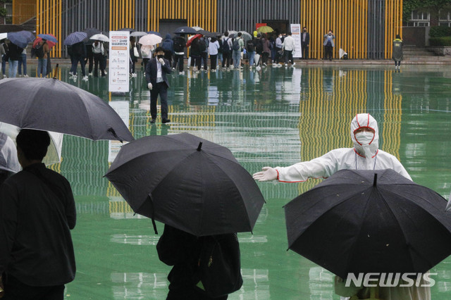 [서울=뉴시스] 박민석 기자 = 방역복을 입은 한 관계자가 24일 오전 SK그룹 신입사원 공채 필기시험(SKCT, SK종합역량평가)이 오프라인으로 진행되는 서울 성북구 서경대학교에서 거리 두고 줄 서기를 안내하고 있다. 2020.05.24.