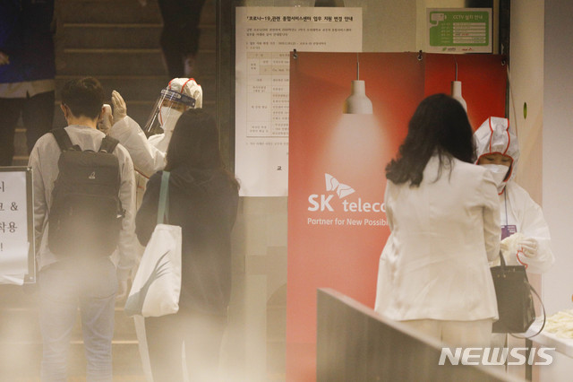 [서울=뉴시스] 박민석 기자 = 시험 응시자들이 24일 오전 SK그룹 신입사원 공채 필기시험(SKCT, SK종합역량평가)이 오프라인으로 진행되는 서울 성북구 서경대학교에서 발열 체크를 받고 있다. 2020.05.24.