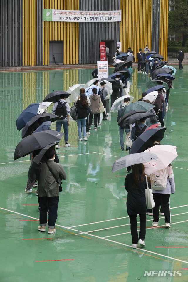 [서울=뉴시스] 박민석 기자 = 시험 응시자들이 24일 오전 SK그룹 신입사원 공채 필기시험(SKCT, SK종합역량평가)이 오프라인으로 진행되는 서울 성북구 서경대학교에서 거리를 두고 줄을 서 있다. 2020.05.24.
