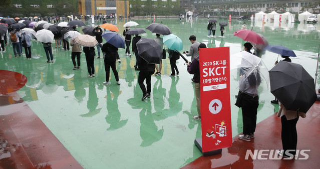 [서울=뉴시스] 박민석 기자 = 시험 응시자들이 24일 오전 SK그룹 신입사원 공채 필기시험(SKCT, SK종합역량평가)이 오프라인으로 진행되는 서울 성북구 서경대학교에서 거리를 두고 줄을 서 있다. 2020.05.24.