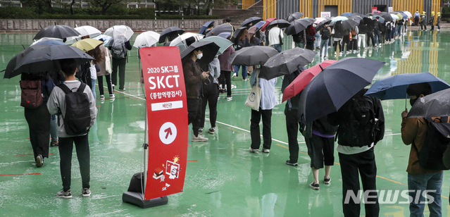 [서울=뉴시스] 박민석 기자 = 시험 응시자들이 24일 오전 SK그룹 신입사원 공채 필기시험(SKCT, SK종합역량평가)이 오프라인으로 진행되는 서울 성북구 서경대학교에서 거리를 두고 줄을 서 있다. 2020.05.24.