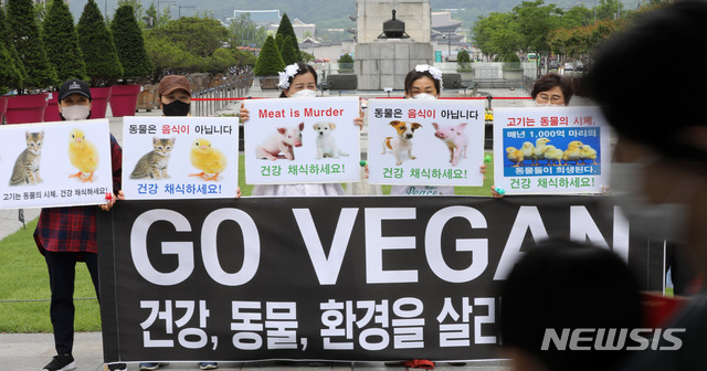 [서울=뉴시스] 고범준 기자 = 비건(Vegan)을 지향하는 모든사람들(비지모) 회원들이 24일 오후 서울 종로구 광화문광장에서 열린 인간의 식용, 실험으로 희생된 동물들을 위로하고 사죄하는 진혼제에서 손 피켓을 들고 있다. 2020.05.24.
