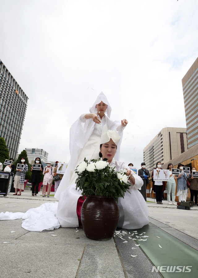 [서울=뉴시스] 고범준 기자 = 비건(Vegan)을 지향하는 모든사람들(비지모) 회원들이 24일 오후 서울 종로구 광화문광장에서 동물들의 영혼을 위로하는 진혼제 퍼포먼스를 하고 있다. 2020.05.24.