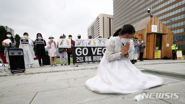 [서울=뉴시스] 고범준 기자 = 비건(Vegan)을 지향하는 모든사람들(비지모) 회원들이 24일 오후 서울 종로구 광화문광장에서 열린 인간의 식용, 실험으로 희생된 동물들을 위로하고 사죄하는 진혼제에서 희생된 동물들을 추모하고 있다. 2020.05.24.