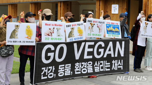 [서울=뉴시스] 고범준 기자 = 비건(Vegan)을 지향하는 모든사람들(비지모) 회원들이 24일 오후 서울 종로구 광화문광장에서 열린 인간의 식용, 실험으로 희생된 동물들을 위로하고 사죄하는 진혼제에서 구호를 외치고 있다. 2020.05.24.