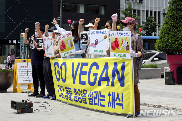 [서울=뉴시스]김병문 기자 = 세계 금연의 날을 맞아 비건을 지향하는 모든 사람들 회원들이 31일 오후 서울 종로구 광화문 광장에서 금연과 건강 채식을 촉구하는 기자회견을 하고 있다. 2020.05.31.