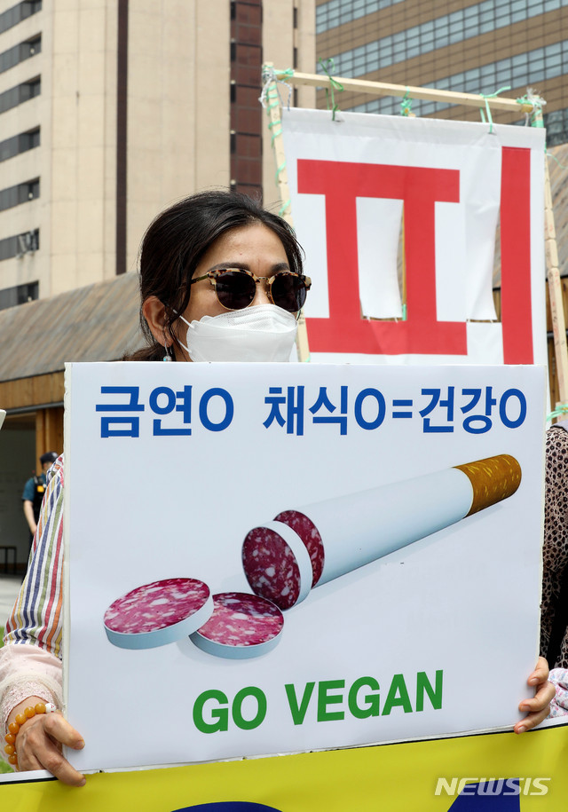 [서울=뉴시스]김병문 기자 = 세계 금연의 날을 맞아 비건을 지향하는 모든 사람들 회원들이 31일 오후 서울 종로구 광화문 광장에서 금연과 건강 채식을 촉구하는 기자회견을 하고 있다. 2020.05.31.