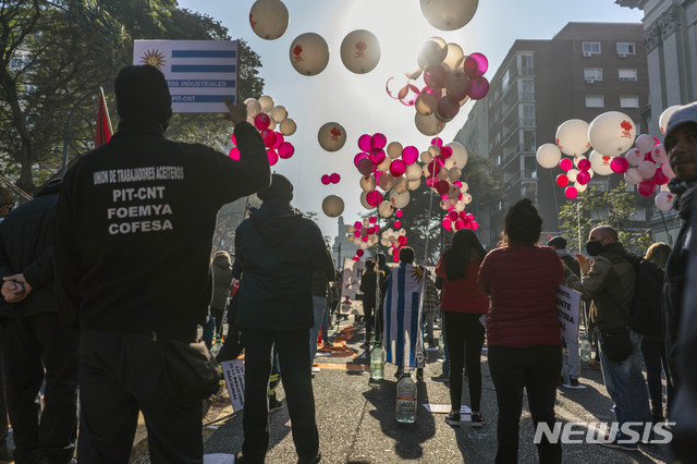 [몬테비데오=AP/뉴시스]4일(현지시간) 우루과이 수도 몬테비데오에서 정부가 제안한 긴급 개혁안에 반대하는 집회가 열려 참가 노동자들이 시위를 벌이고 있다. 시위대는 수십 개 분야에 영향을 미치는 이 개혁안이 파업과 시위 등 노동자의 권리를 제한한다고 주장하며 시위에 나섰다. 2020.06.05.
