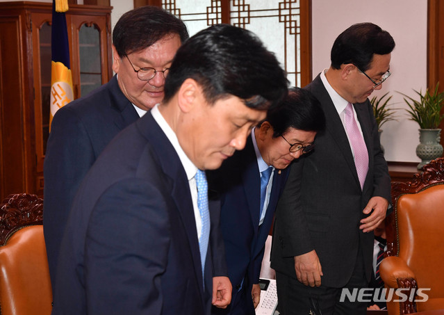 [서울=뉴시스] 장세영 기자 = 7일 오후 서울 여의도 국회 의장실에서 박병석 국회의장 주재로 열린 여·야 원내대표회동에 참석한 박병석 의장과 원내대표가 기념촬영을 마친 뒤 자리로 향하고 있다. 왼쪽부터 김태년 더불어민주당 원내대표, 김영진 더불어민주당 원내수석부대표, 박병석 의장, 주호영 미래통합당 원내대표. 2020.06.07.