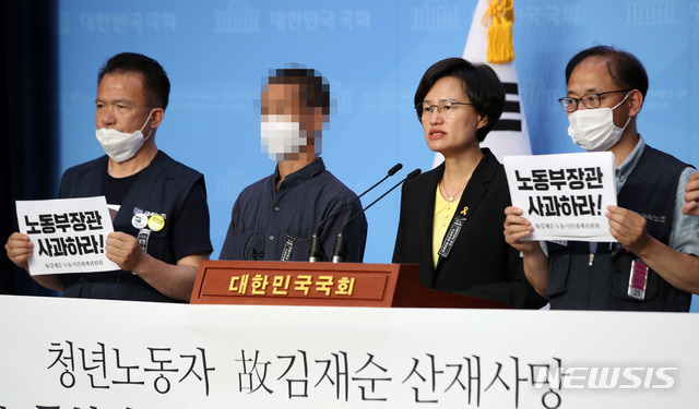 [서울=뉴시스]김선웅 기자 = 강은미 정의당 의원, 故 김재순노동시민대책위원회가 10일 오전 서울 여의도 국회 소통관에서 기자회견을 열고 청년노동자 故 김재순 씨 산재사망과 관련해 고용노동부 장관의 사과, 조선우드 사업주 구속 및 중대재해기업처벌법 제정을 촉구하고 있다. 2020.06.10.