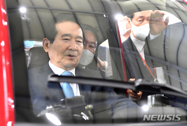 [영광=뉴시스] 신대희 기자 = 정세균 국무총리가 17일 전남 영광군 대마전기차산업단지 대풍EV자동차 공장에서 전기차 제조 공정 관련 설명을 듣고 있다. 2020.06.17.