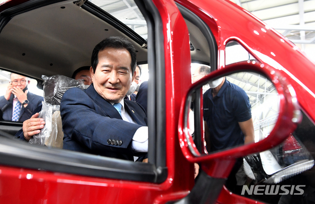 [영광=뉴시스] 신대희 기자 = 정세균 국무총리가 17일 전남 영광군 대마전기차산업단지 대풍EV자동차 공장에서 전기차 제조 공정 관련 설명을 듣고 있다. 2020.06.17.