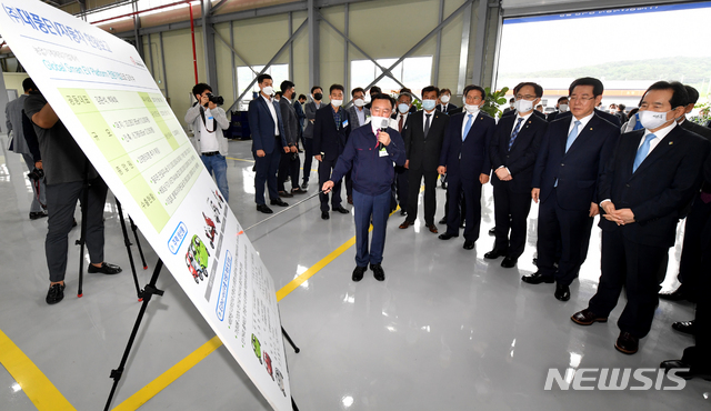 [영광=뉴시스] 신대희 기자 = 정세균 국무총리(오른쪽)가 17일 전남 영광군 대마전기차산업단지 대풍EV자동차 공장에서 전기차 제조 공정 관련 설명을 듣고 있다. 2020.06.17.