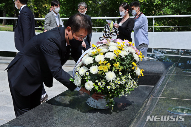 [서울=뉴시스] 고범준 기자 = 윤종인 행정안전부 차관이 19일 오후 부산광역시 남구 국립일제강제동원역사관에서 열린 '기억의 터(위패관)' 개관식에 참석해 추모비에 헌화하고 있다. (사진=행정안전부 제공) 2020.06.19.