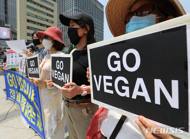 [서울=뉴시스] 박미소 기자 = '비건을 지향하는 모든 사람들(비지모)' 회원들이 21일 오전 서울 종로구 광화문 광장에서 열린 '코로나 바이러스감염증(코로나19) 근본대책은 채식이라 주장하며 채식을 권유하는 기자회견'에서 손피켓을 들고 있다. 2020.06.21.
