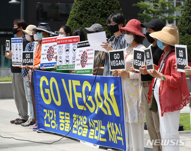 [서울=뉴시스] 박미소 기자 = 21일 오전 서울 종로구 광화문 광장에서 '비건을 지향하는 모든 사람들(비지모)' 회원들이 코로나 바이러스감염증(코로나19) 근본대책은 채식이라 주장하며 주최한 채식 권유 기자회견이 열리고 있다. 2020.06.21.