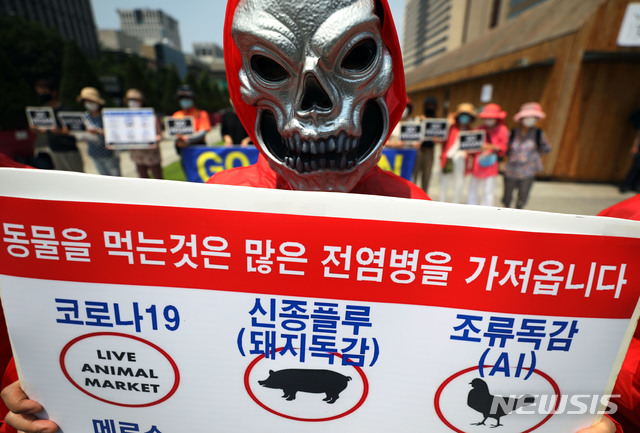 [서울=뉴시스] 박미소 기자 = '비건을 지향하는 모든 사람들(비지모)' 회원들이 21일 오전 서울 종로구 광화문 광장에서 코로나 바이러스감염증(코로나19) 근본대책은 채식이라 주장하며 주최한 채식 권유 기자회견에서 퍼포먼스를 하고 있다. 2020.06.21.
