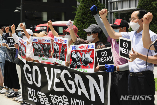 [서울=뉴시스] 박민석 기자 = '비건(Vegan)을 지향하는 모든 사람들' 단체 회원들이 28일 오후 서울 종로구 광화문광장에서 '동물 해방, 동물 권리를 촉구하는 기자회견'을 하고 있다. 2020.06.28.