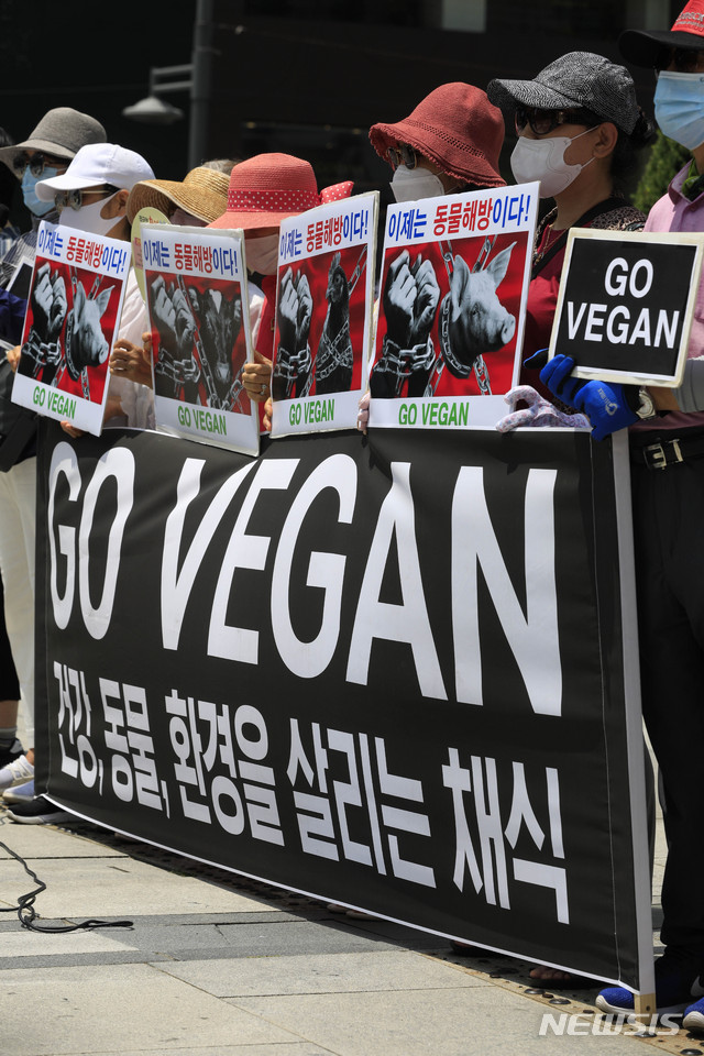 [서울=뉴시스] 박민석 기자 = '비건(Vegan)을 지향하는 모든 사람들' 단체 회원들이 28일 오후 서울 종로구 광화문광장에서 '동물 해방, 동물 권리를 촉구하는 기자회견'을 하고 있다. 2020.06.28.