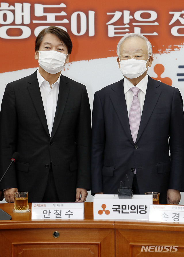 [서울=뉴시스] 최동준 기자 = 안철수 국민의당 대표가 13일 서울 여의도 국회 국민의당을 방문한 손경식 한국경영자총협회 회장과 간담회 전 기념촬영을 하고 있다. 2020.07.13.