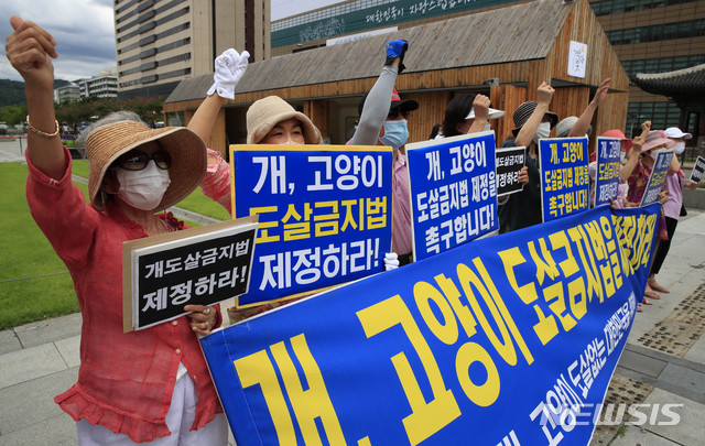 [서울=뉴시스] 박민석 기자 = 중복인 26일 서울 종로구 광화문광장 이순신 장군 동상 앞에서 비건 세상을 위한 시민모임 회원들이 기자회견을 열고 개도살 금지법 제정을 촉구하고 있다. 2020.07.26.