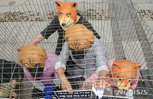 [서울=뉴시스] 박민석 기자 = 중복인 26일 서울 종로구 광화문광장 이순신 장군 동상 앞에서 비건 세상을 위한 시민모임 회원들이 기자회견을 열고 개도살 금지법 제정을 촉구하는 퍼포먼스를 하고 있다. 2020.07.26.